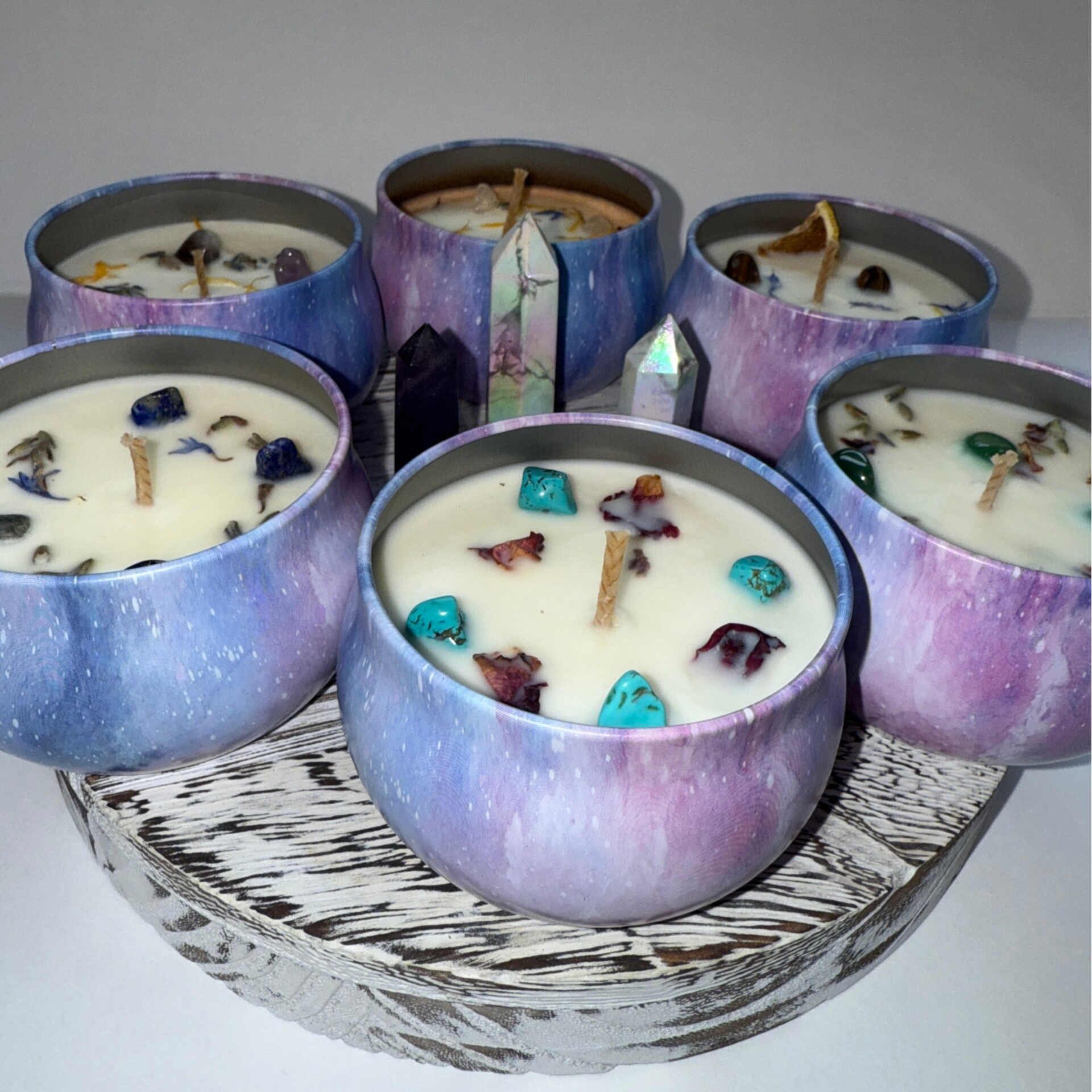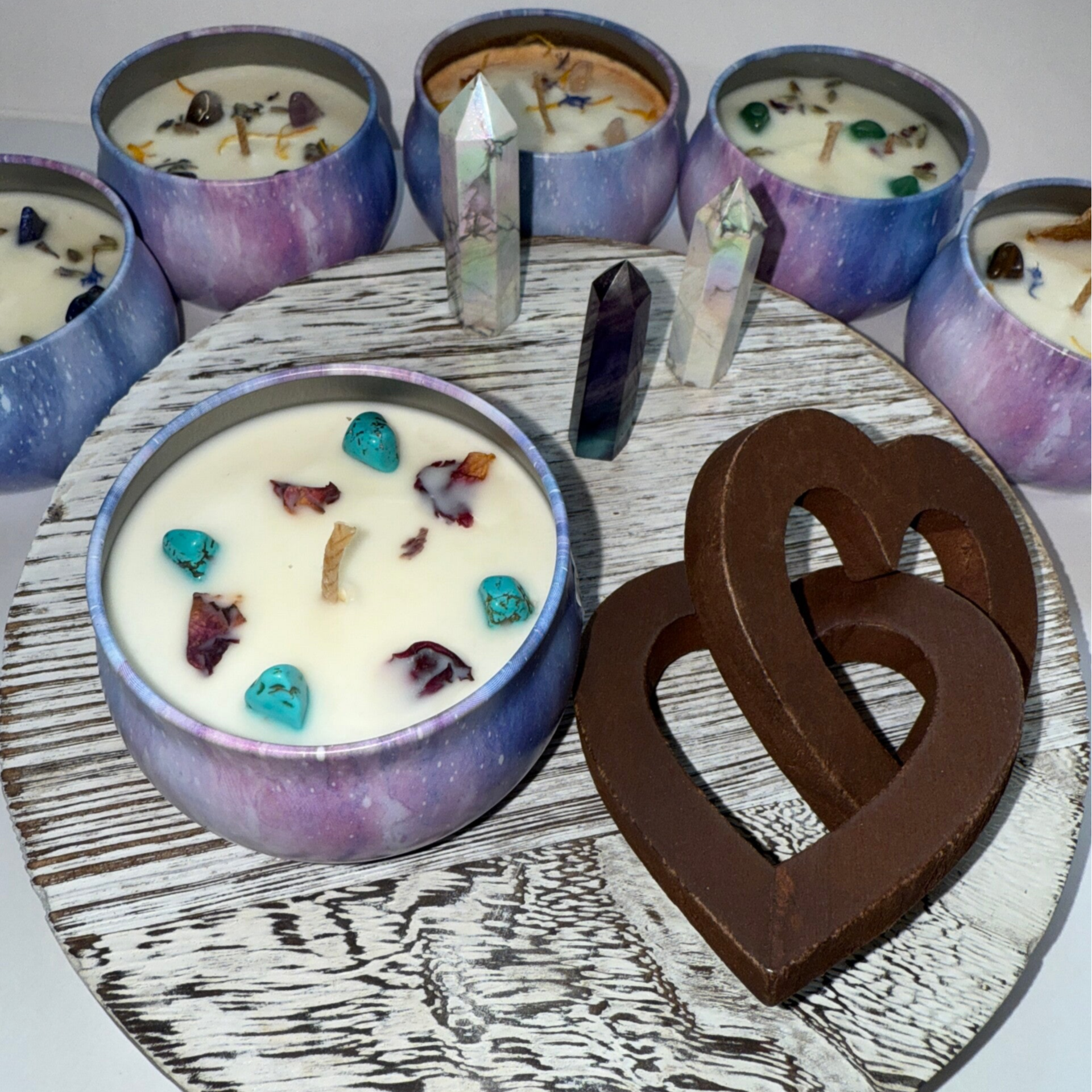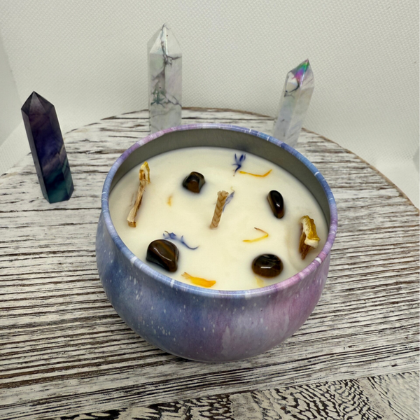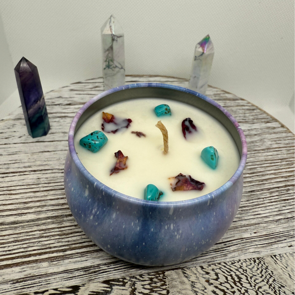4oz soy wax candle with a soy wax wick with genuine crystal, and flower petals in a beautiful pink and blue tie dyed style coloured metal tin with a fragrance load of 8% please read the included instructions with your purchase or see our FAQ page on website on how to burn your candle safely. Please note that our candles may be delivered with or develop a slight frosted or crystalline appearance. This is known as "frosting", it is a common characteristic of high-quality, natural soy wax and does not affect the performance or safety of the candle it is purely aesthetic also some fragrance oils can cause the wax to take on a yellow, tan or off-white hue. This discolouration is purely aesthetic and does not affect the candle's performance this can be seen in the pictures of the Love Rose Quartz candle due to the fragrance oil reacting with the metal tin.