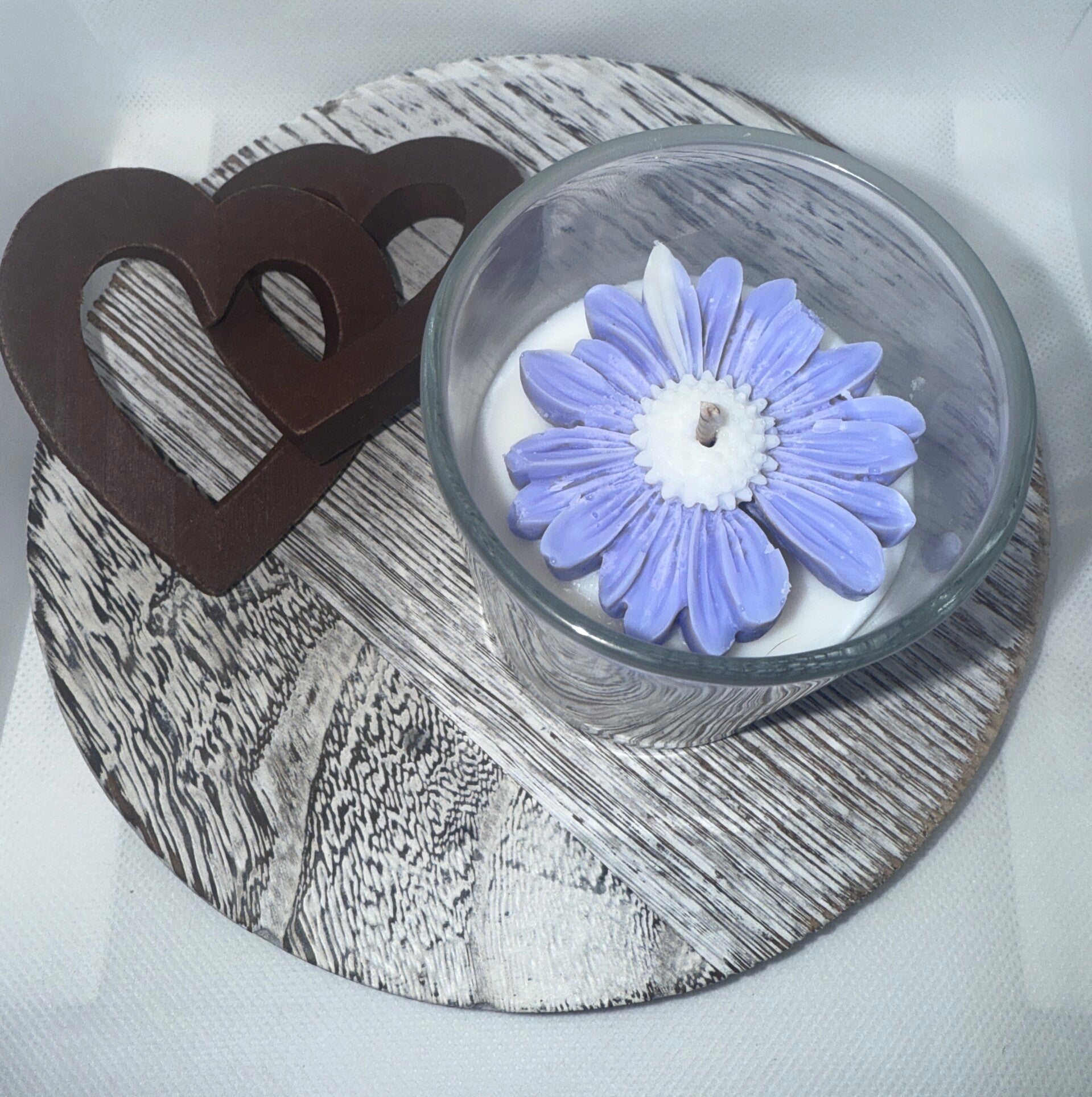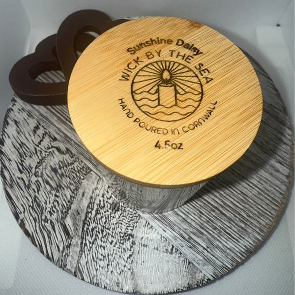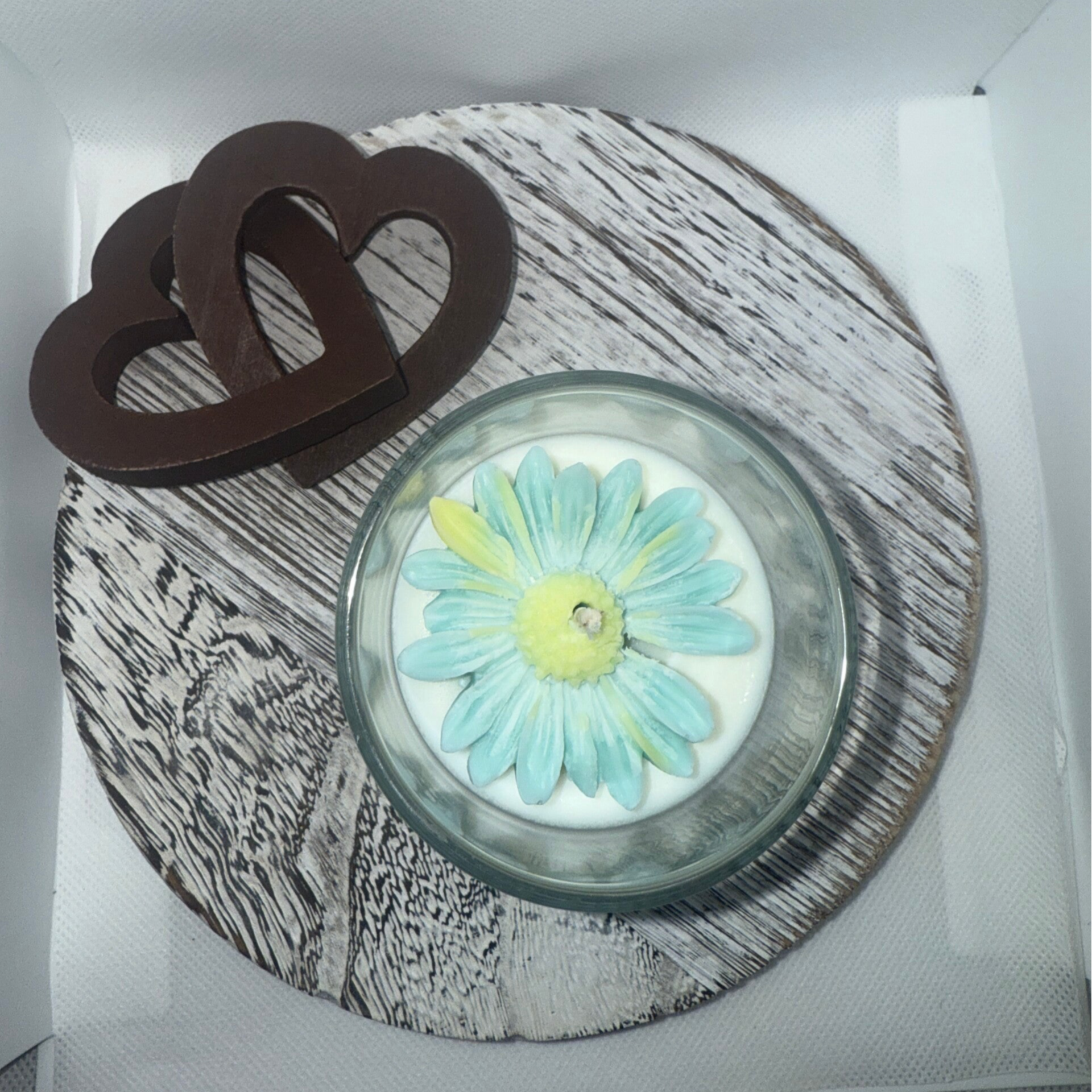 Sunshine Daisy and Sea Shells are scented soy wax candle with cotten soy wick with a beautiful coloured daisy scented with coconut and vanilla, vanilla, fresh linen or unscented or shells scented with sea breeze or coconut island, these are made out of scented soy wax on top of 4.5oz of scented candle in a glass jar with a wooden lid there are few choices of colours and scent this candle has a fragrance load of 8% please read the included instructions with your purchase or see our FAQ page on website on how to burn your candle safely please remove lid while burning and replace only when candle has cooled down. Please note that our candles may be delivered with or develop a slight frosted or crystalline appearance , This is known as "frosting", there may also be some air bubbles (wet spots) these are a common characteristic of high-quality, natural soy wax and does not affect the performance or safety of the candle it is purely aesthetic also some fragrance oils can cause the wax to take on a yellow, tan or off-white hue. This discolouration is purely aesthetic and does not affect the candle's performance.