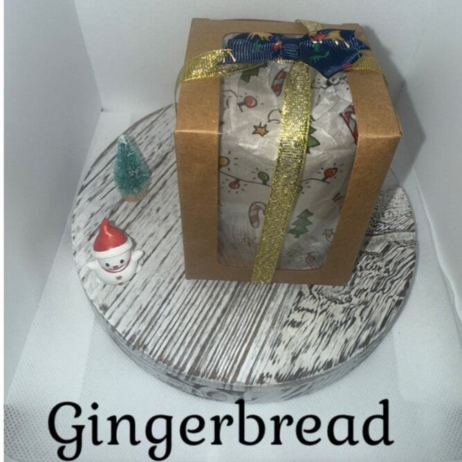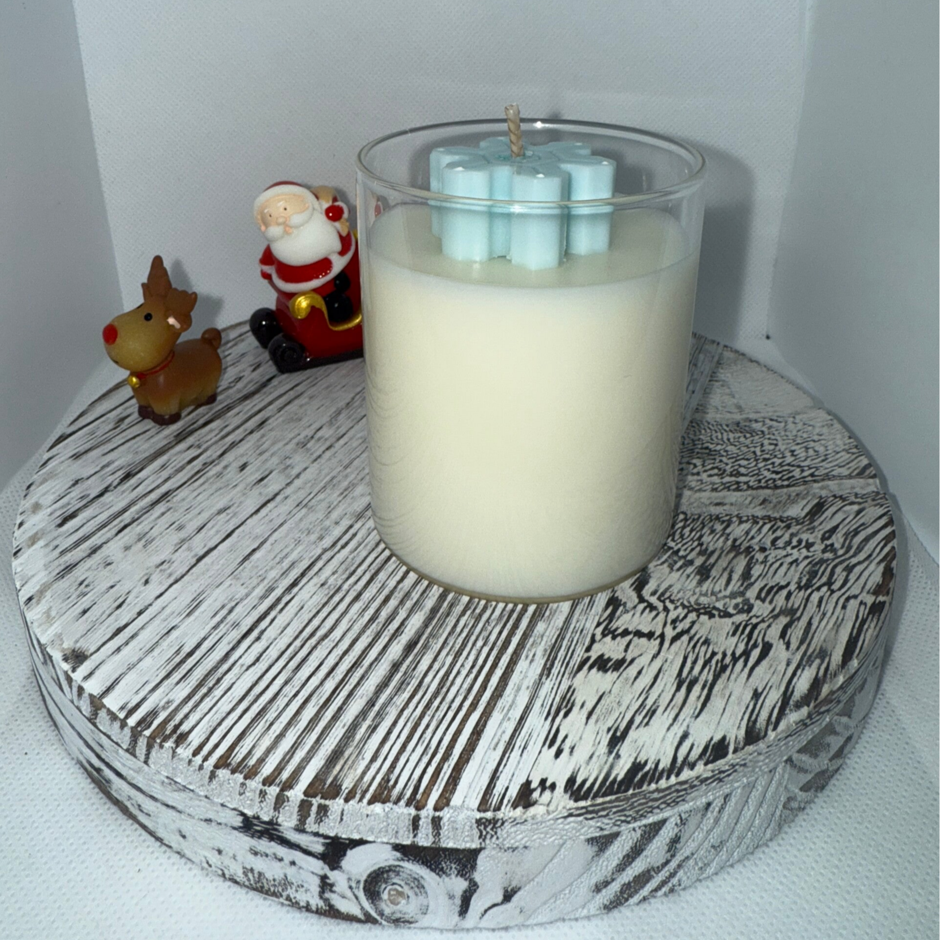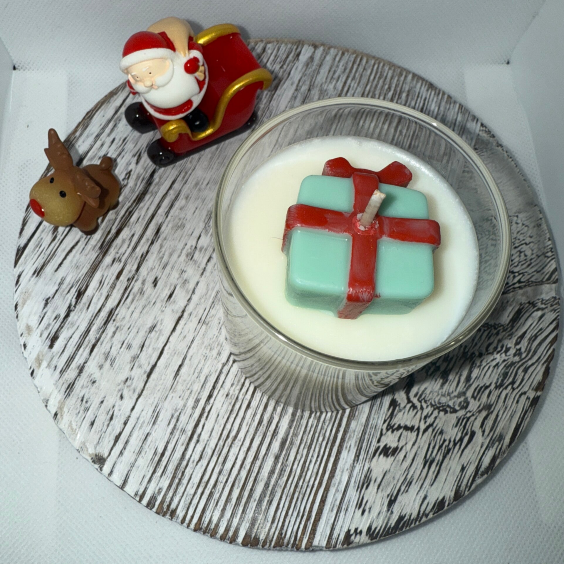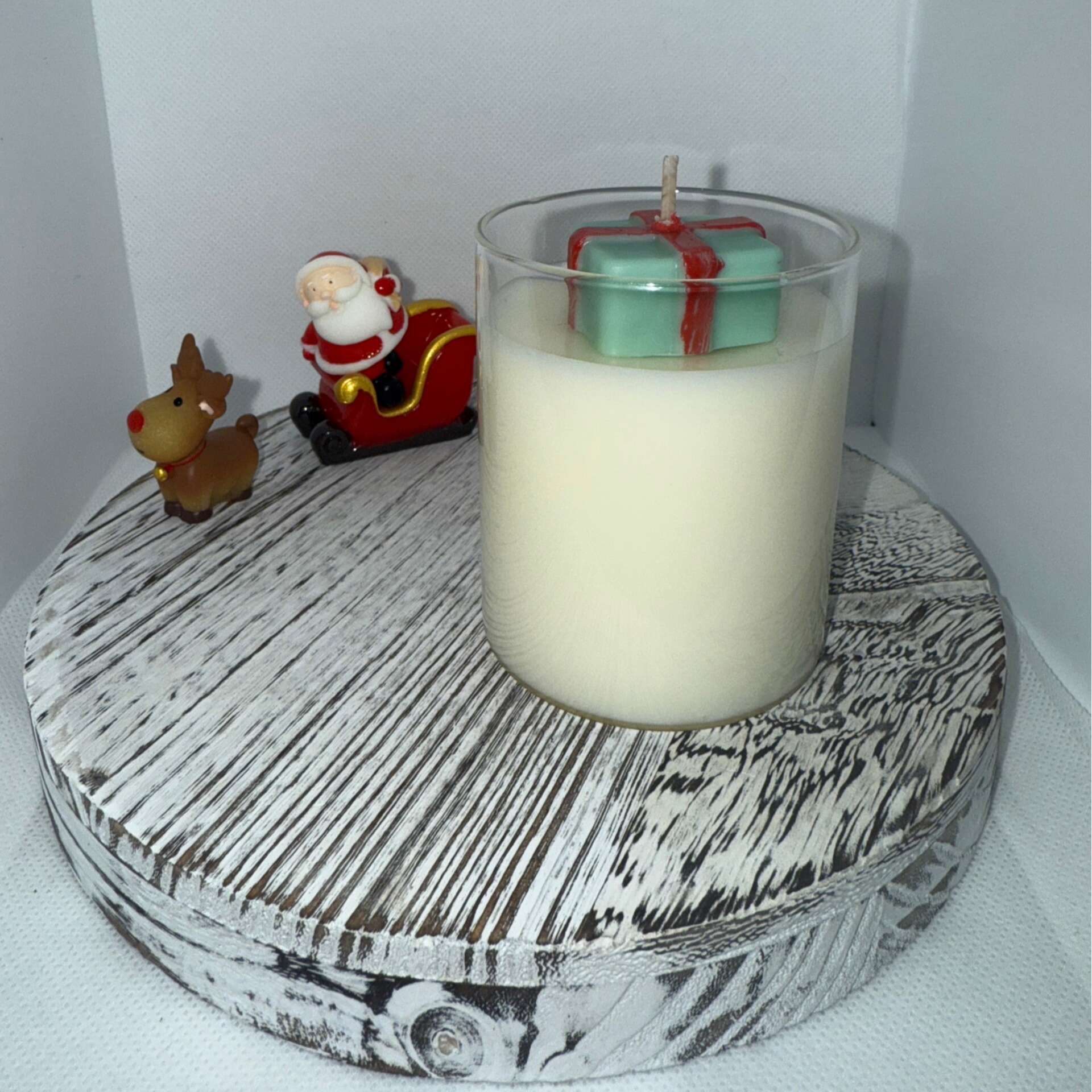 Scented soy wax 6oz candle with a soy wax wick with a Christmas tree, snowflake, present, gingerbread person, snowman, Santa or candy cane on top in a glass jar, presented wrapped in tissue paper in a window box with ribbon and a bow, the lid for the jar will be sent with the candle so once the candle has finished you can reuse the jar will be sent wrapped in Christmas paper in a window box and a bow