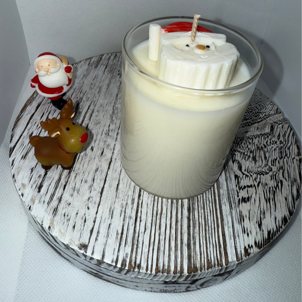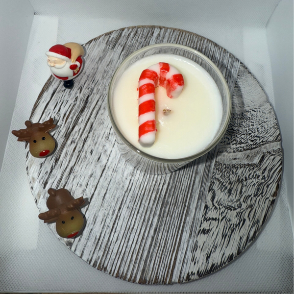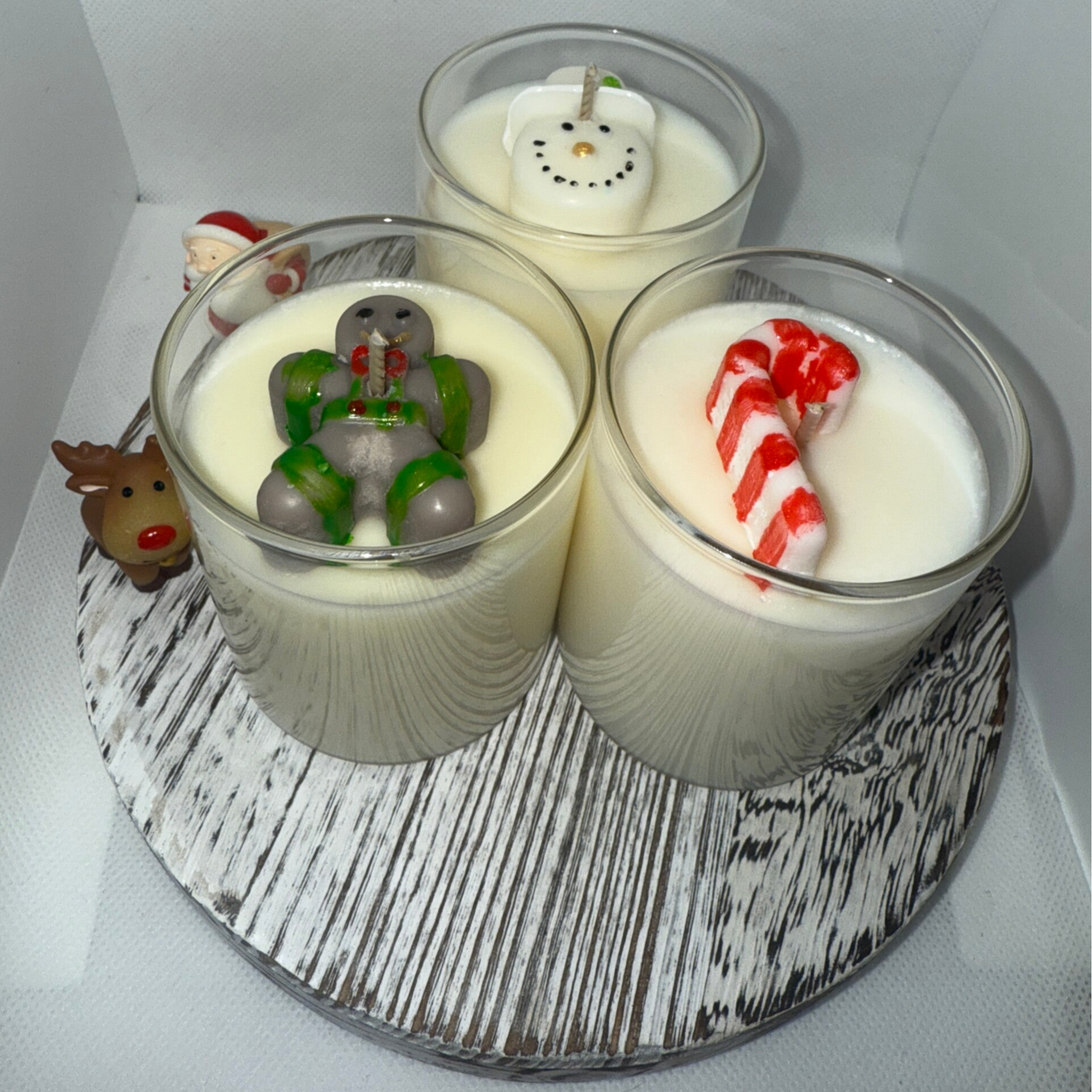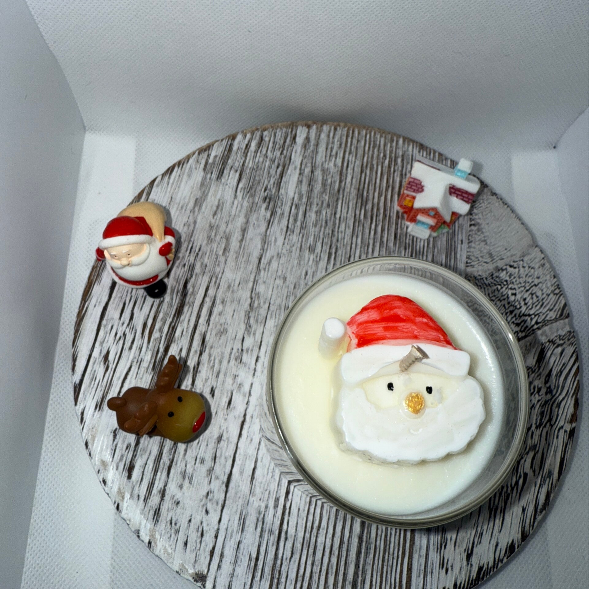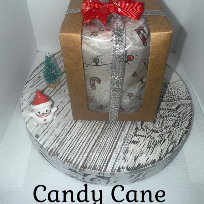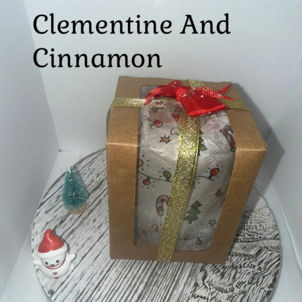 Scented soy wax 6oz candle with a soy wax wick with a Christmas tree, snowflake, present, gingerbread person, snowman, Santa or candy cane on top in a glass jar, presented wrapped in tissue paper in a window box with ribbon and a bow, the lid for the jar will be sent with the candle so once the candle has finished you can reuse the jar will be sent wrapped in Christmas paper in a window box and a bow