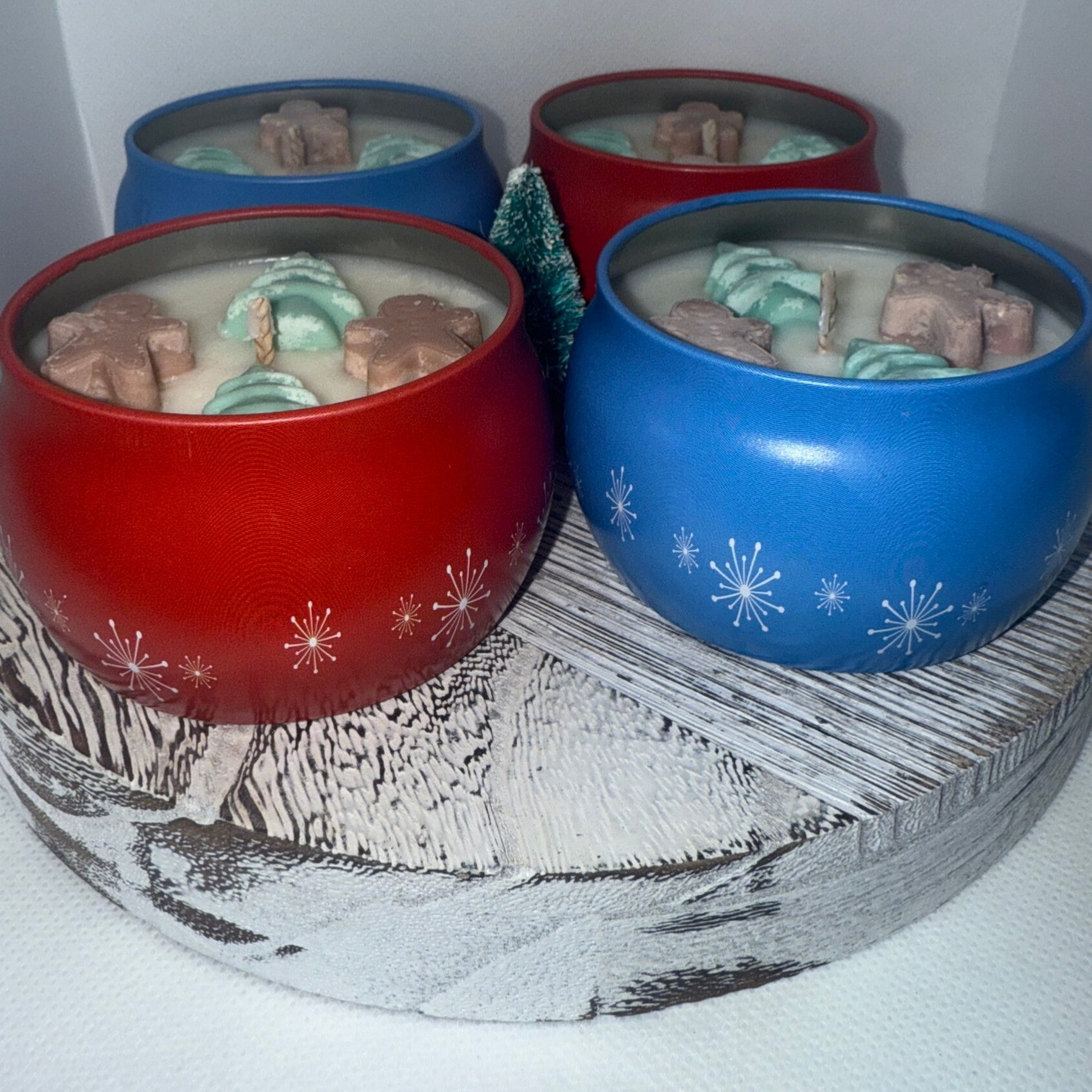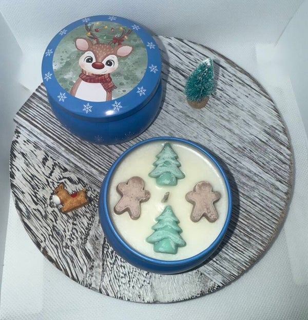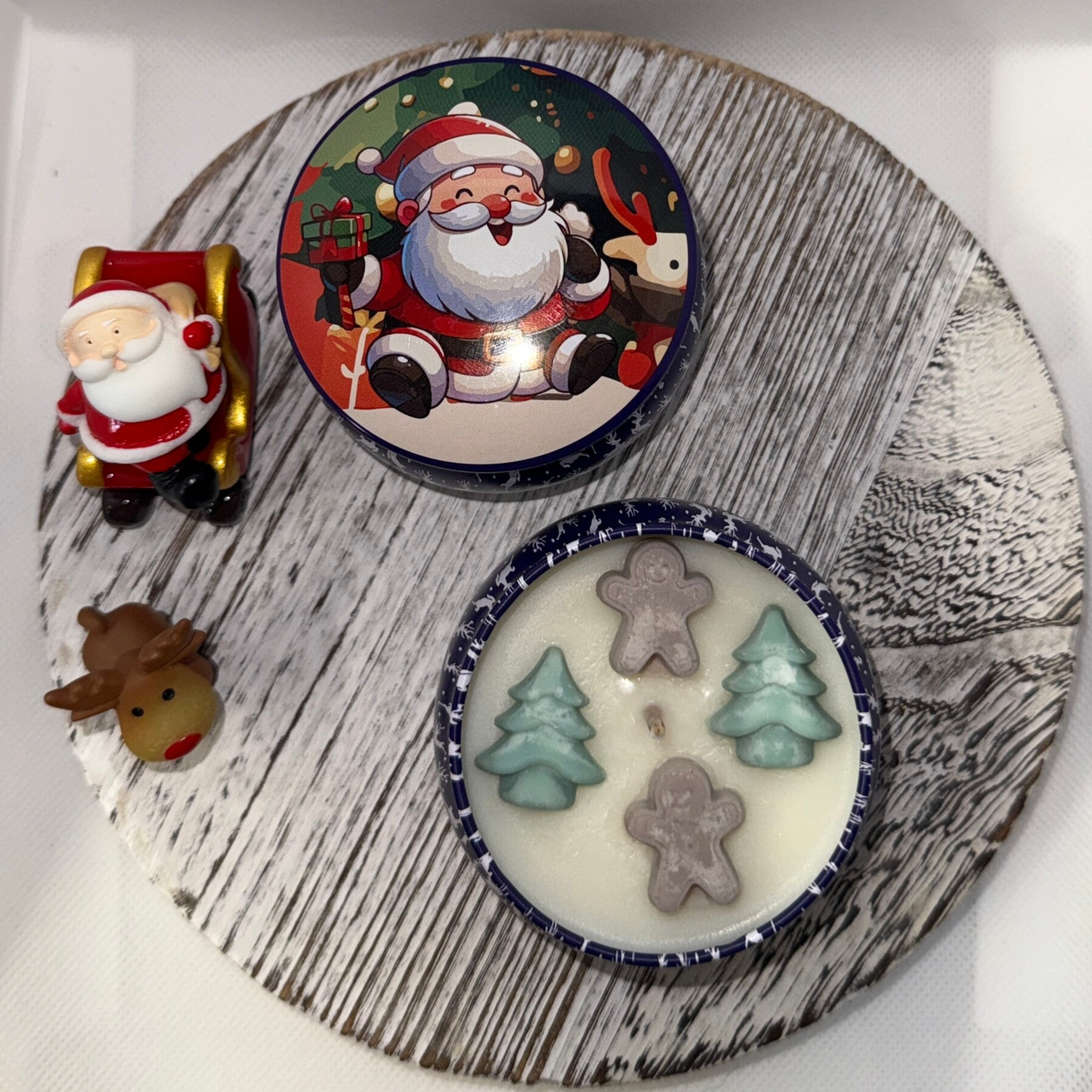 Scented soy wax 4.4 oz candle with a soy wax wick with soy wax Christmas tree and gingerbread man on top, hand poured in a Christmas themed metal tin with a lid,