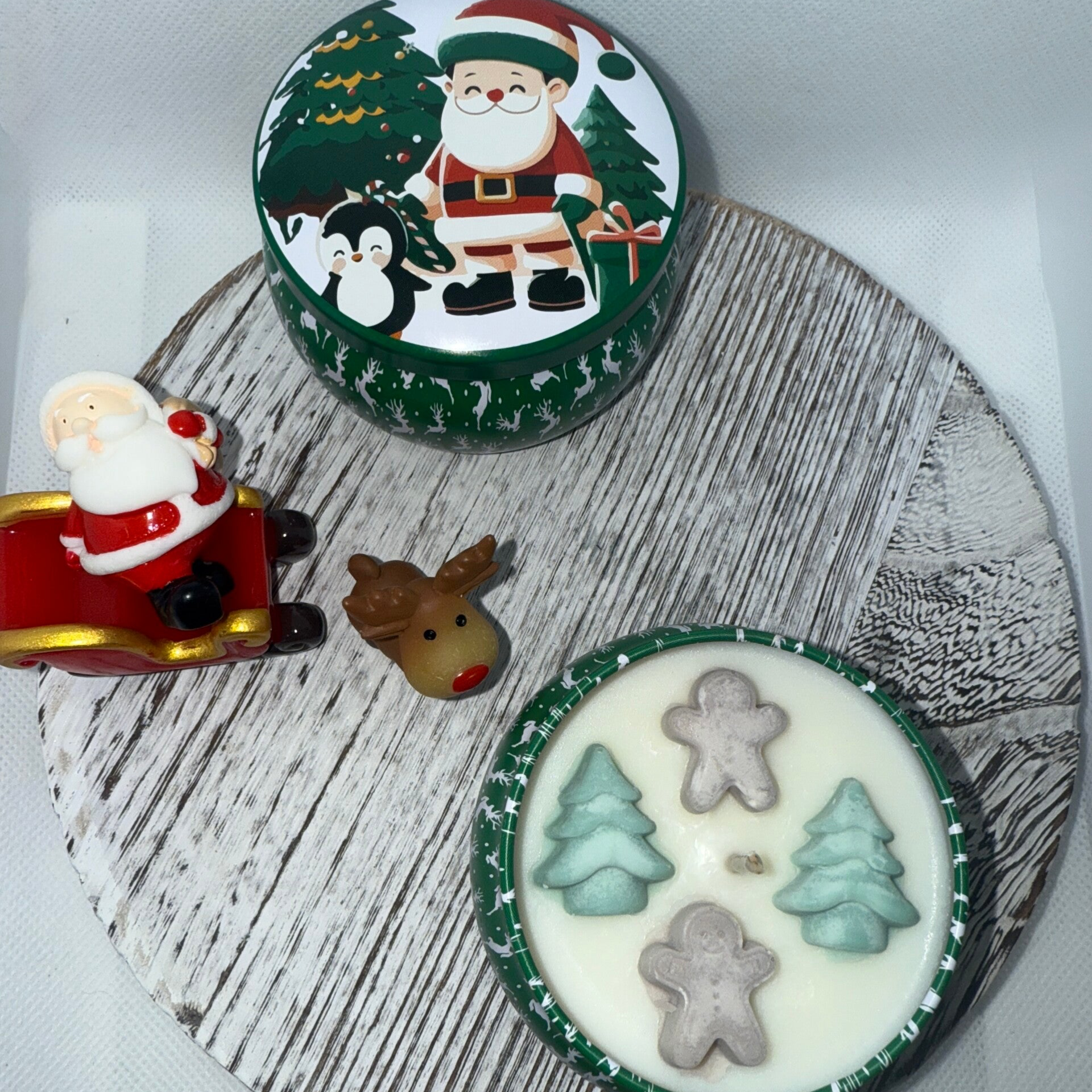 Scented soy wax 4.4 oz candle with a soy wax wick with soy wax Christmas tree and gingerbread man on top, hand poured in a Christmas themed metal tin with a lid,