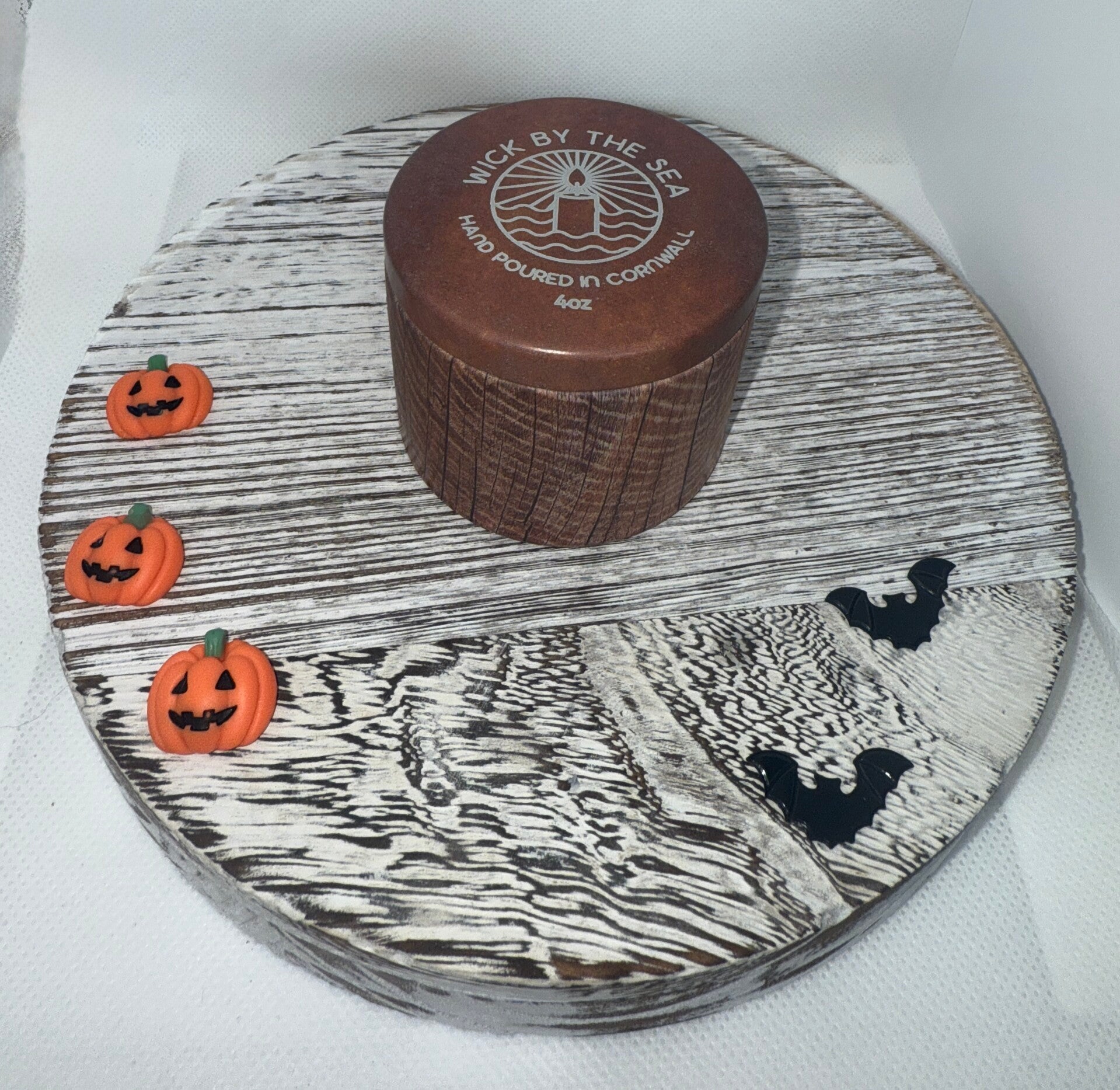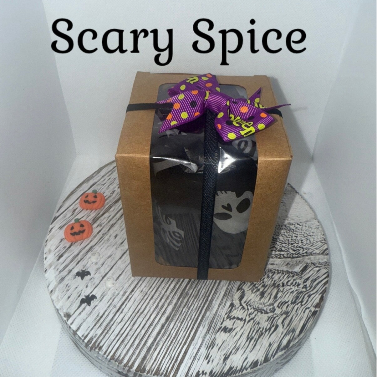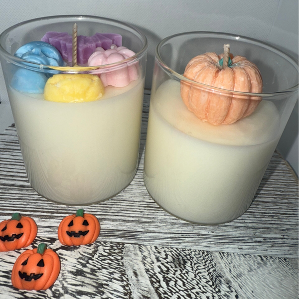 5oz natural soy wax candle and soy wick with a pumpkin on top this candle is hand poured in a glass jar 6oz total, presented wrapped in pumpkin tissue paper in a box with black ribbon and and orange bow which can be used as a hair bow, the lid for the jar will be sent with the candle so once the candle has finished you can reuse the jar will be sent wrapped in Halloween paper in a window box and a bow