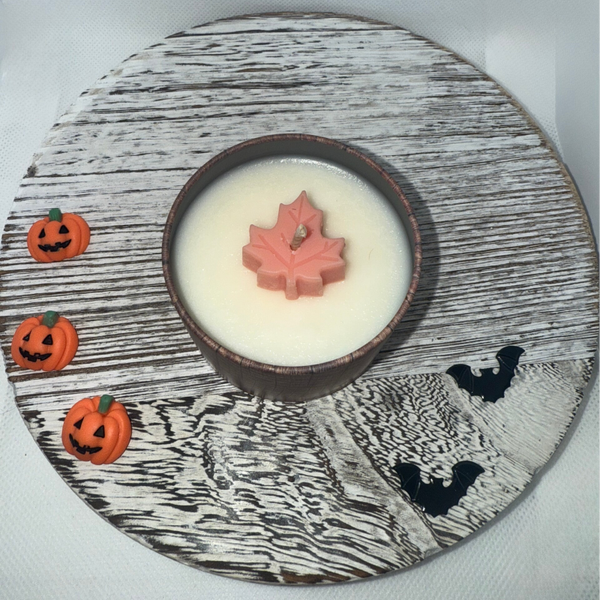 4oz natural soy wax with a soy wick with a soy wax maple leaf on top, hand poured in a wooden effect metal tin with lid