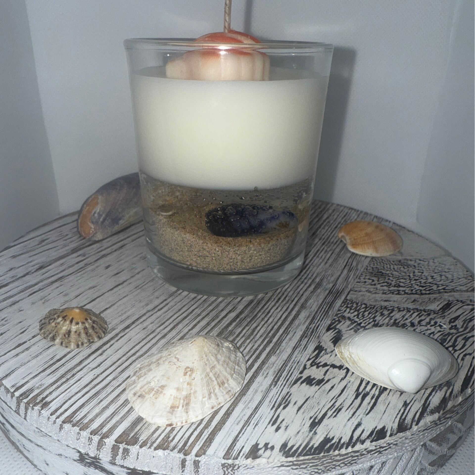 Clear gel wax encapsulates real Cornish sand and shells this layer is purely ascetic and is not burnable, on top is 4oz natural soy wax and a soy wax wick with a wax scollop shell on top which is wicked and is burnable all hand poured in a glass jar, presented in a window box, the lid for the jar will be sent with the candle so once the candle has finished you can reuse the jar.